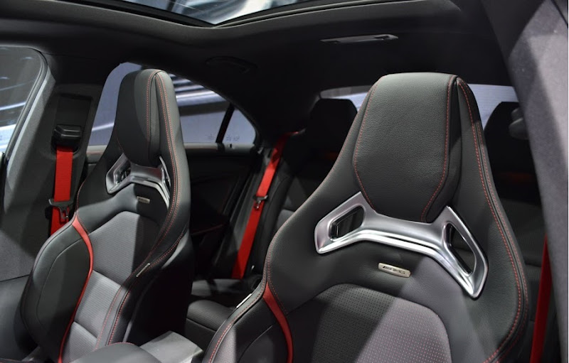 CLA 45 AMG與一般版CLA內裝上也有著極大的差異,一打開車門,映入眼簾的紅黑配色賽車坐椅、紅色車縫線、紅色安全帶、碳纖維飾板,馬上將體內的熱血因子全部激發出來,最大的不同莫過於打擋桿位置,一般版CLA排檔趕為在方向機,感覺就少了些什麼,而CLA 45 AMG則是位在傳統的位置,操控著七速雙離合器變速箱,短小的短行程排擋桿賽車味十分濃厚,經過AMG家持後的內裝不僅戰鬥氣息滿分,還不失原來的高質感。