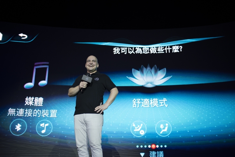 me connect先進互聯功能重點歸納,接著由轎車行銷業務處副總裁何睿思Mr. Markus Henne上台,為將上市的The new A-Class作出最完整的介紹,除了外觀、內裝、動力系統的更新,以及最先進4.5代Intelligent Drive智慧駕駛輔助系統的導入,最不能錯過的則是史上最智能多媒體系統MBUX的精闢介紹,包含了結合智能聲控與觸控介面的多導航系統、多媒體觸控螢幕、含操作提示與觸控回饋的觸控手寫板等等。何睿思副總甚至在介紹之中大秀MBUX智能聲控的驚人功能,何睿思副總簡單的說:「你好賓士,這裡好熱」,MBUX:「好的,幫你調至20度。」,MBUX從調整溫度、車內氣氛燈甚至是放音樂等,都在語音指令之下作動,讓現場車迷驚呼連連。