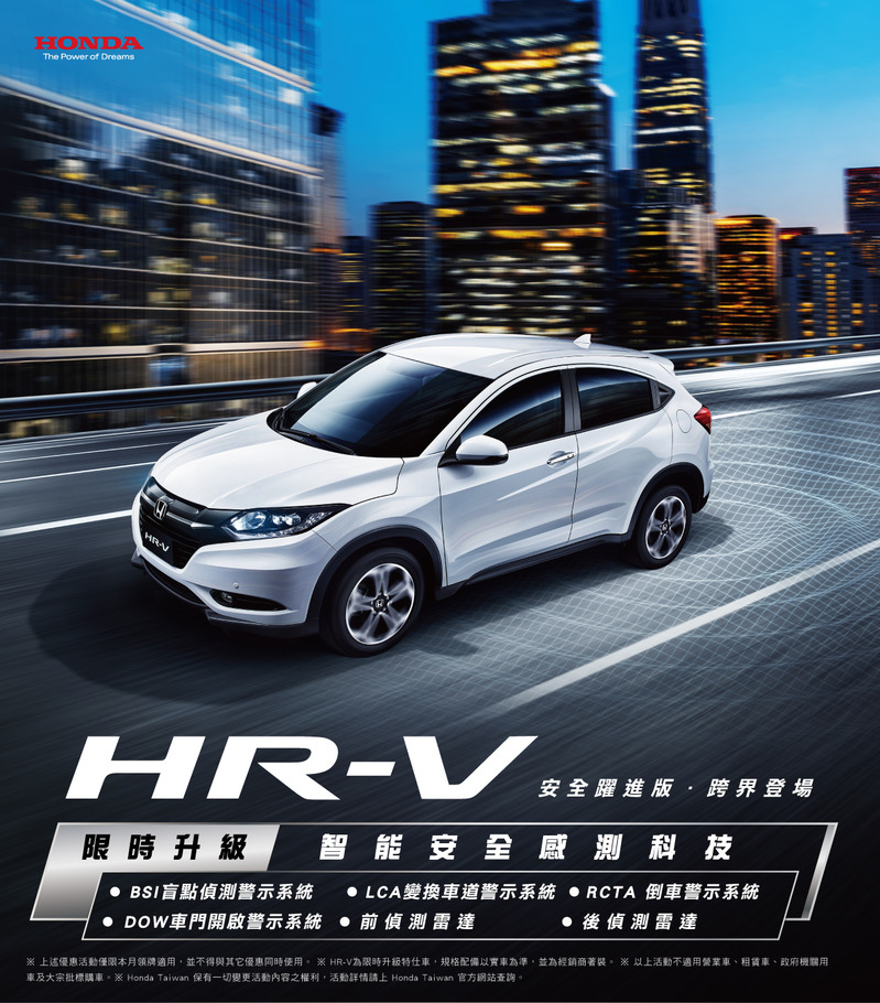Honda Taiwan為了擴大駕乘「HR-V」跨界跑旅的喜悅,即日起限時升級加碼、推出安全守護再升級的「HR-V 安全躍進版」。「HR-V 安全躍進版」免費升級「智能安全感測科技」,此系統整合了「前偵測雷達」、「後偵測雷達」、「BSI盲點偵測警示系統」、「LCA變換車道警示系統」、「RCTA倒車警示系統」、「DOW車門開啟警示系統」等高規格安全系統,提供了再升級的主動安全防護功能。