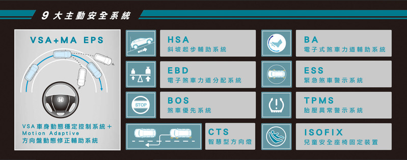 在主動安全部份,Honda HR-V標配九大主動安全系統,實現Honda對安全的至高標準。在被動安全部份,Honda HR-V採用Honda獨有、最新進化的G-CON技術,及兼具「提升自我保護能力」與「減低對方車輛傷害」的ACE 高剛性鋼骨防護車體結構,輔以具有最大防護效能的6 SRS 輔助氣囊(S等級)等被動安全裝備。