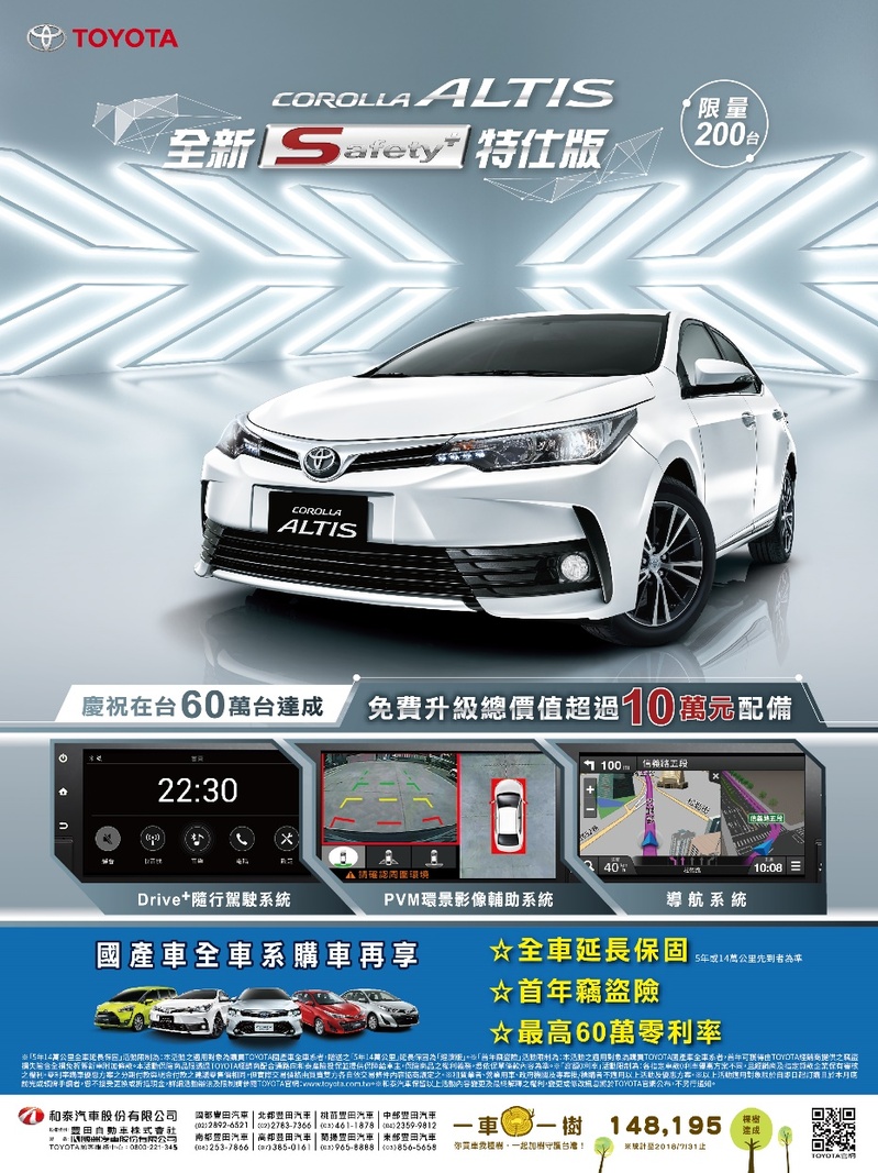 為感謝60萬車主見證及支持,本月特別推出全新Altis Safety+特仕版,除搭載TOYOTA極致安全防護系統(包含6SRS氣囊(豪華)、BSM盲點偵測雷達系統(豪華)、VSC車輛穩定控制系統、TRC循跡防滑控制系統、TPMS胎壓偵測警示系統、ISO-FIX兒童座椅固定機構…等主被動安全配備),再升級Drive+隨行駕駛系統、PVM環景影像輔助系統、及導航系統,優惠總值超過10萬元!本次全新Safety+特仕版限量200台,敬請把握購車時機!