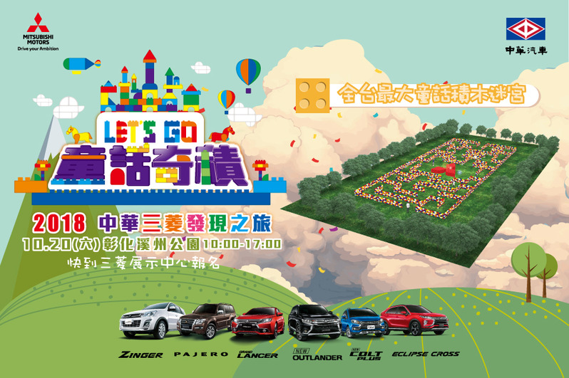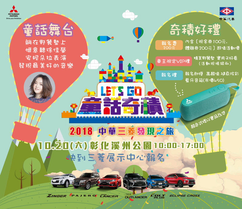 中華三菱關懷台灣這片土地,將一年一度的「發現之旅」活動,與在地特色結合,邀請大家探訪台灣這片美麗的土地並走訪台灣各縣市鄉鎮,體驗在地人文之美。今年10/20(六)特地在彰化溪洲公園打造了一座讓大人、小孩都為之瘋狂的「積木童話世界」,呈現「童話奇積」活動主題,並規劃一系列歡樂幸福感的主題活動,讓現場朋友們沉浸於童話世界歡樂氛圍,FUN玩各式積木並透過精彩的演出徜徉在童話世界中,盡情釋Fun童心。活動壓軸的舞台演出,更力邀2018金曲獎雙料歌后徐佳瑩現場演唱,讓大家再享天籟饗宴!即日起,歡迎到全台MITSUBISHI展示中心報名,200元報名費,可獲得一本活動手冊,內含現金券100元及6張價值200元現場活動體驗券,還有市價450元的隨身炫彩藍牙音箱,名額有限,動作要快!