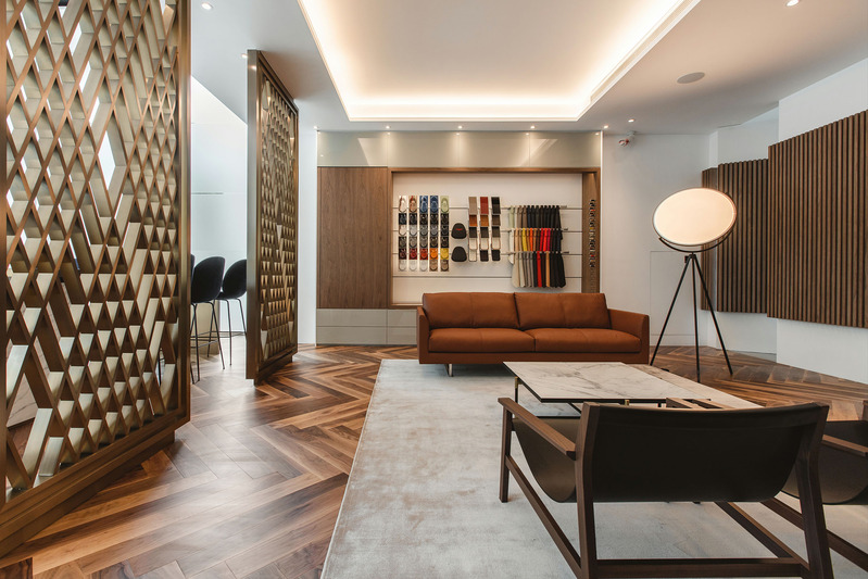以饒富簡約氣息的黃銅隔屏巧妙地區隔出的是後方的貴賓休憩區及個人特製選配區;貴賓休憩區則採用一貫的木質色系,讓每位客人等待車輛保養的時間,能夠暫時忘卻繁雜瑣事,投身於舒適靜謐的休息空間。休憩區另外配置了個人特製選配區,提供多樣化車色及各式材質選擇,讓貴賓在閒適氛圍中挑選不同的客製化車藝配製,為個人愛車打造專屬創意風格。