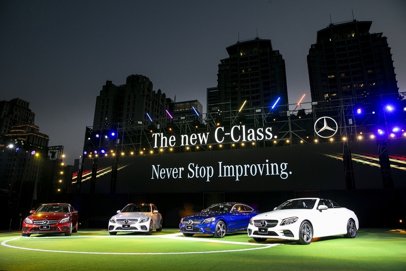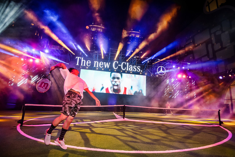 而到了晚間7點半時刻,The new C-Class 新車發表大秀正式展開,首創的「賓士三向桌球場」揭開了活動序幕,打破傳統桌球競賽規格的表現秀,桌球好手陳晏永、李佳宸與台灣賓士轎車行銷業務部副總裁何睿思(Markus Henne) 展開對決,大螢幕上更出現選手的戰力分析,伴隨著 The new C-Class Sedan 轎車的精彩影片拉出首波高潮;緊接著舞台一旁的「三對三街頭籃球場」中,發出了籃球鞋激烈摩擦地面的聲音、籃球全力彈起的聲響,寶島夢想家隊當家控球後衛陳世念領銜的隊伍與大前鋒陳孝榮領軍隊的隊伍展開激烈競爭,雙方的賽前戰力分析更是不分上下,同時 The new C-Class Estate 旅行車出現在舞台的影片畫面中;經過兩場精彩的賽事後,進入中場休息時間,由競技啦啦隊領銜出場,而在各大體育賽事中常出現的 T-Shirt 槍及 Kiss Cam 更現場民眾猶如置身真實賽事中,讓現場觀眾情緒沸騰。在歡呼聲中,「三對三籠式足球場」又傳出了球員們盤球、過人的吆喝聲,對決組合則是世大運救國哥陳浩瑋領隊對抗中華男足國腳陳昭安,說時遲那時快,The new C-Class Coupé 雙門轎跑車成為了舞台影片畫面中的主角;而壓軸登場的 The new C-Class Cabriolet 敞篷車,則在「賓士三向網球場」中由網球好手朱禹衡、詹仁瑋以及何睿思(Markus Henne)同場競技中首度現身!