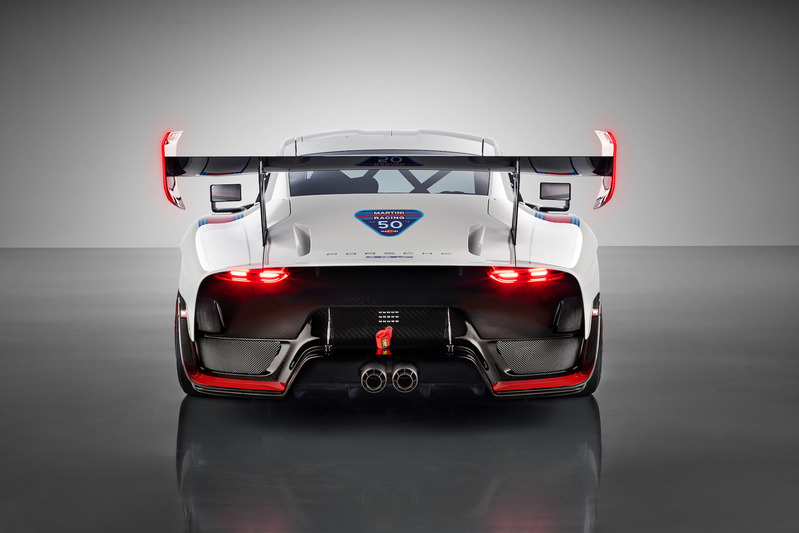 外觀設計部分展現了向保時捷歷史上的經典桂冠車款的致敬:與935/78採用相同的空力輪圈蓋,整合後尾翼尖端的LED煞車燈則源自LMP1 組別賽車的919 Hybrid。後照鏡則是向現任利曼大賽冠軍的911 RSR的造型致敬,排氣管配置與1968年Porsche 908相同的外露式鈦合金排氣管。