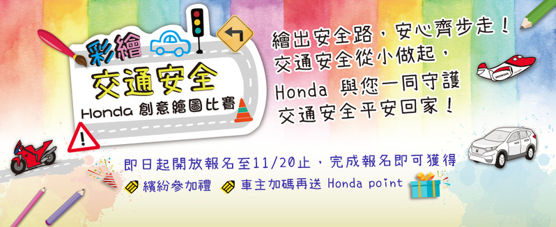 自2018年10月1日起至2018年11月20日止,Honda Taiwan竭誠歡迎3~12歲、對繪畫著色有興趣的小朋友踴躍參加「彩繪交通安全 Honda創意繪圖比賽」,只要於活動期間內完成繪圖作品,並繳回至全國Honda Cars, 即可獲得精美繽紛好禮;全國評選佳作,還可獲得獎學金。