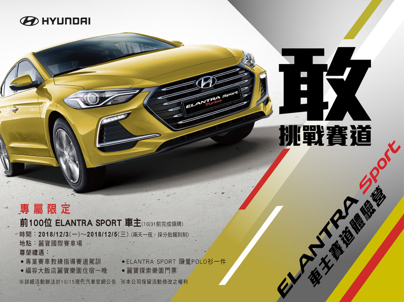 ELANTRA Sport車主賽道體驗營」賽道駕訓活動名額資格,詳細活動辦法於10月15日HYUNDAI現代汽車官網公告。