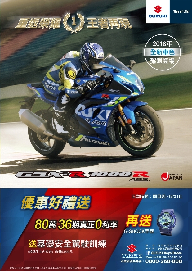 MotoGP仕樣彰顯"KING IS BACK"王者氣息。日本原裝GSX-R1000台灣價格: 69.8萬,GSX-R1000R台灣價格: 82.8萬。即日起至12月底為主,凡入主2018年式GSX-R1000R,即贈送分期好康80萬36期0利率方案與市價約萬元好禮,限量MOTOGP ECSTAR G-SHOCK聯名錶款。