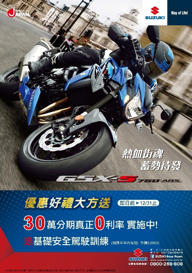 承襲GSX-R750 跑車的 DNA,SUZUKI GSX-S750即以輕量化、易操控、暢快的加速感,俐落又充滿氣勢的車身線條,成為消費者心中排氣量運動型街車的首選,而引擎經過重新調校與搭配車架的卓越韌性後,具體展現跑車靈魂的動力輸出及加速澎湃無比快感。GSX-S750: 42.8萬。2018年生產機種,消費者可享超值優惠購車方案,零頭款超低月付6888元。本活動為低利率專案,實際月付金額及期數將依您個人信用及貸款條件略有不同, 詳情請洽SUZUKI授權經銷商。