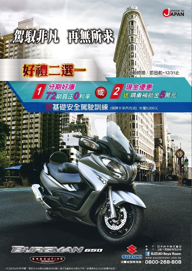日本原裝進口 BURGMAN 650 "0"頭款 "0"利率 或現金購車補助5萬元