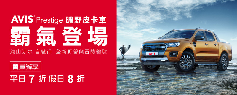 符合時下新興野營需求,AVIS安維斯租車推出全新尊榮車款「曠野皮卡車」,可隨心所欲遊遍全台旅遊祕境,與親友締造超凡旅遊體驗,2018年10月12日起於全台站點提供服務,至12月31日止,消費者於AVIS安維斯租車官網免費註冊會員,選擇「曠野皮卡車」,享平日7折(週一至週四)及假日8折(週五至週日)優惠,感受新世代冒險挑戰的樂趣。