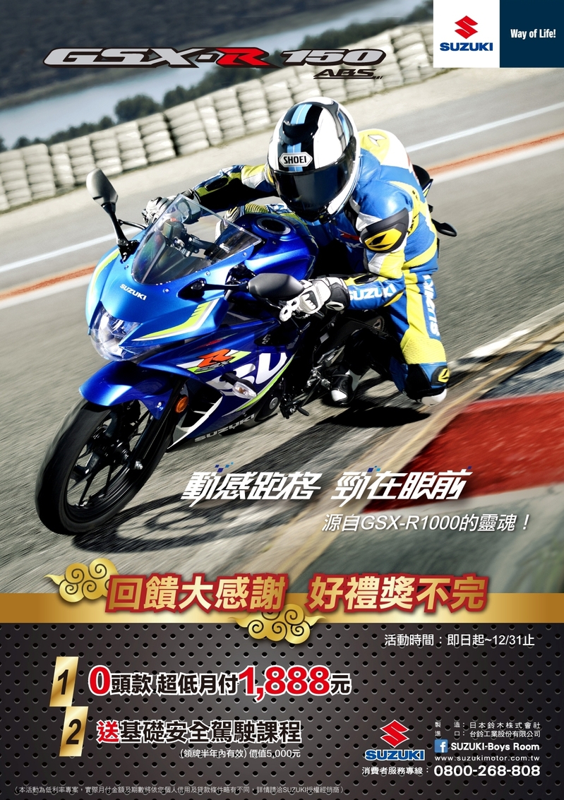 GSX-R150/S150,源於GSX-R1000家族強悍DNA及強大19.2PS馬力,DOHC雙凸輪軸引擎,R版配備Keyless無鑰匙啟動系統,GSX-R150 價格: 12.8萬,GSX-S150價格:11.8萬。準車主可享零頭款,超低利率,首年超低月付1,888元起專案,本活動為低利率專案,實際月付金額及期數將依您個人信用及貸款條件略有不同。該機種贈送基礎安全駕駛訓練課程(價值約5,000元,領牌半年內有效詳情請洽SUZUKI授權經銷商。