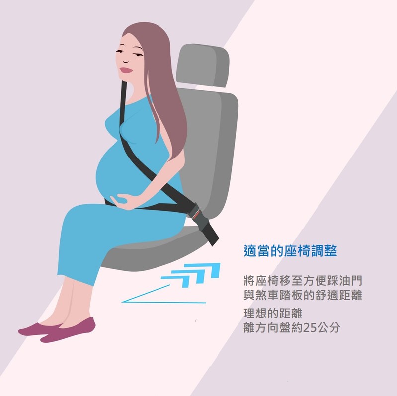 將座椅移至方便踩踏油門與煞車踏板的舒適距離,理想的距離是離方向盤約25公分,如此當事故發生且安全氣囊作動時,才能保護媽咪的腹部。若車輛配備可調式方向盤,建議將方向盤的中心指向遠離腹部和胸部的位置。調整座椅位置後,務必調整車內後視鏡和外後視鏡。當背部覺得不適時,可在背後放一個小圓枕或捲一條毛巾,以提高駕駛時的乘坐舒適度。