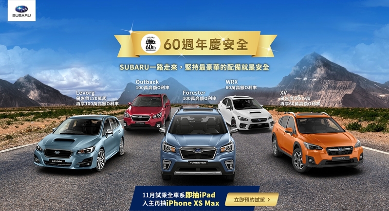 不僅如此,為慶祝SUBARU 60周年,11月份全台展間將於每個周末規畫極致安全賞車試乘活動,更加碼舉辦「天天試乘抽iPad」及「領牌再抽全新iPhone XS Max」的抽獎回饋活動,期盼能以最具誠意的購車禮遇,實質回饋給每一位慧眼獨具喜歡SUBARU的準車主,輕鬆入主SUBARU超凡座駕!