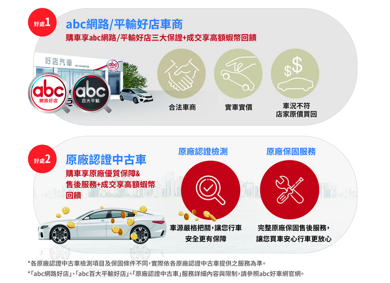 根據調查*4指出有使用過中古車網站經驗的網友中,近45%的人最怕遇到「真實車況與網路上敘述不一致」,abc好車網為解開消費者買中古車的疑慮,本次於蝦皮商城的車輛皆為嚴格把關的「abc網路/平輸好店」、「各品牌原廠認證中古車」,承諾在消費者購車前預先把關優質車源,並以三大安心保證及原廠認證解決購買中古車的弊病。