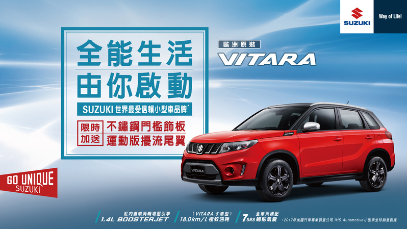 感謝廣大的消費者支持,VITARA才能持續熱銷三十年,並使SUZUKI成為全球最受信賴的小型車品牌。即日起至11月30日止,凡購買VITARA車款,領牌就送「不鏽鋼門檻飾板」及「運動版擾流尾翼」,兩項個性勁化套件,全能生活,由你啟動!