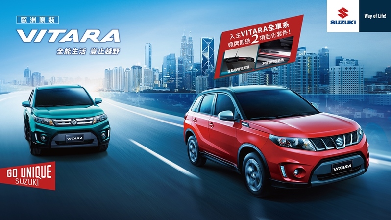 2018年11月凡領牌VITARA車款贈送「不鏽鋼門檻飾板及運動版擾流尾翼」兩項勁化套件之促銷方案,VITARA全車系皆適用,期間為自2018年11月01日起至2018年11月30日止,且須於2018年11月30日前完成領牌程序者有效。