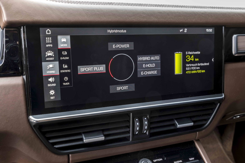 全新Cayenne E-Hybrid 的螢幕介面及控制按鍵均經過重新配置,並與 918 Spyder超跑極為相似。其中最令人驚豔之處就是標配跑車計時套件的駕駛模式切換旋鈕,讓車主能夠直接從方向盤上選擇豐富的駕駛模式,即便是電子儀表板上的複合動力系統專屬螢幕在功能性上也源自於 918 Spyder。位於儀表中央的電量表顯示目前使用或恢復的電量資訊,Boost Assistant動能增壓輔助則顯示可用於加速輔助的電量,而Hybrid assistant複合動力輔助能幫助分配純電駕駛電力、視覺化燃油引擎介入時機,並顯示精確計算的剩餘純電行駛里程。全新保時捷通訊管理系統的 12.3 吋觸控螢幕在 Hybrid 複合動力選單中提供更多資訊,駕駛可透過該選單查看目前電流、耗用程度、剩餘純電里程,以及零排放駕駛部分。