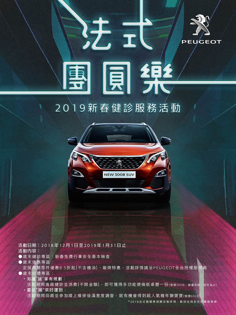 PEUGEOT法式團圓樂以關懷車主們年節返鄉出遊前車輛保養之需求,給予最實質與貼心的服務內容,免費提供PEUGEOT全車系健檢項目及車況諮詢,在年節來臨前做好詳備的安全健診。除此之外,也提供保養相關零件優惠價8.5折起(不含機油)及鈑烤特惠,讓您的愛車從裡到外除舊佈新,平平安安馳騁一整年。