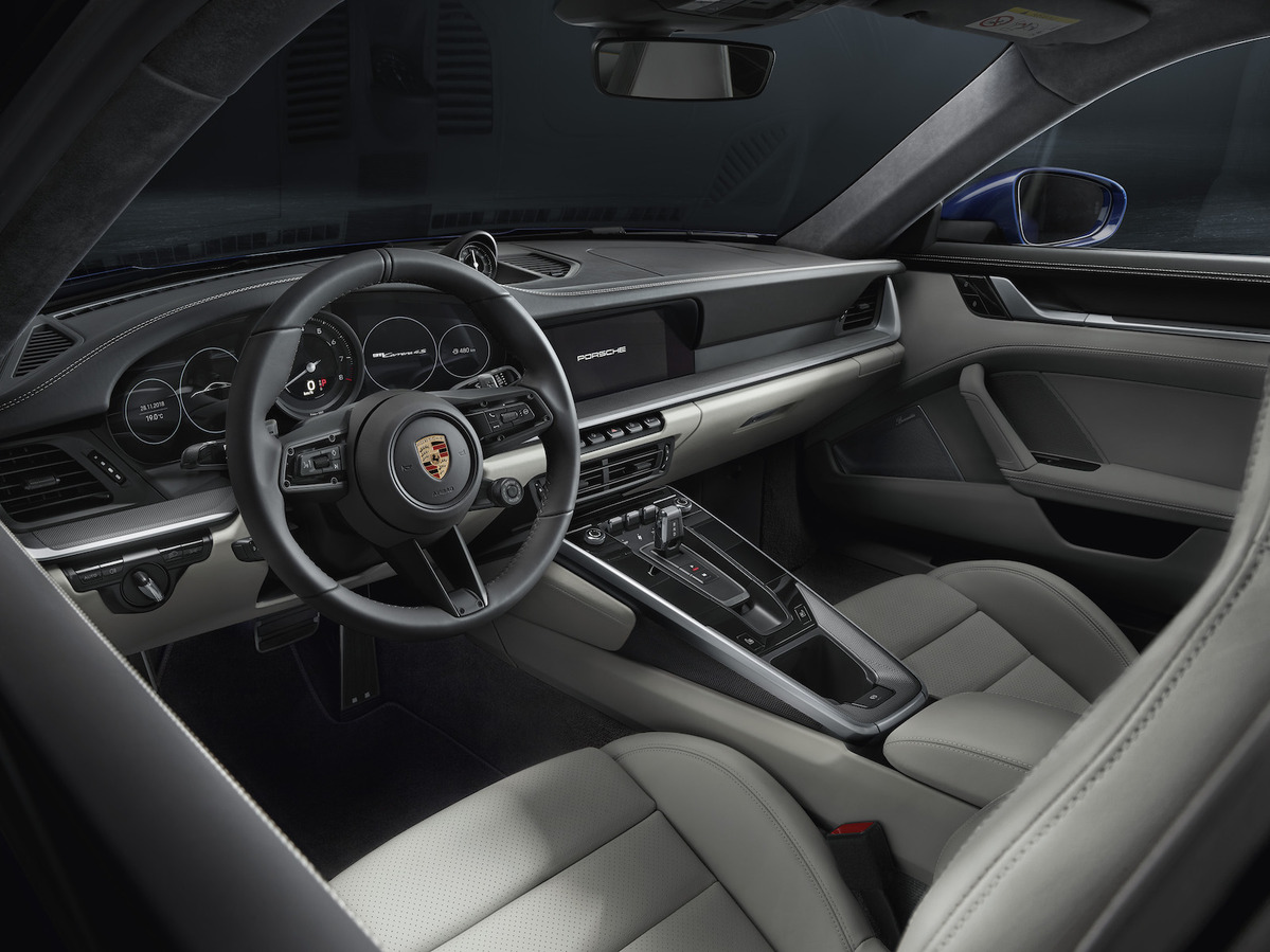嶄新的座艙陳設,俐落清晰的線條勾勒數位化儀錶板,靈感源自 1970 年代的 911 車型;保時捷一貫的傳統 - 位於儀錶板中央的類比式轉速表兩側是無邊框多功能顯示幕,提供駕駛必要資訊。保時捷通訊管理系統的中控台螢幕放大至 10.9 吋,全新配置使操作更快速且直覺化。螢幕下方是五個精巧的開關,可控制車輛重要功能。911 更透過全時連線、全新功能及服務實現數位化,邁向未來移動生活嶄新紀元。標準配備的保時捷通訊管理系統功能包含利用大數據整合的網路導航與Porsche Connect Plus系統。