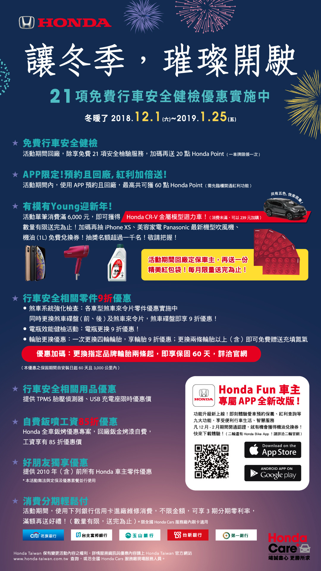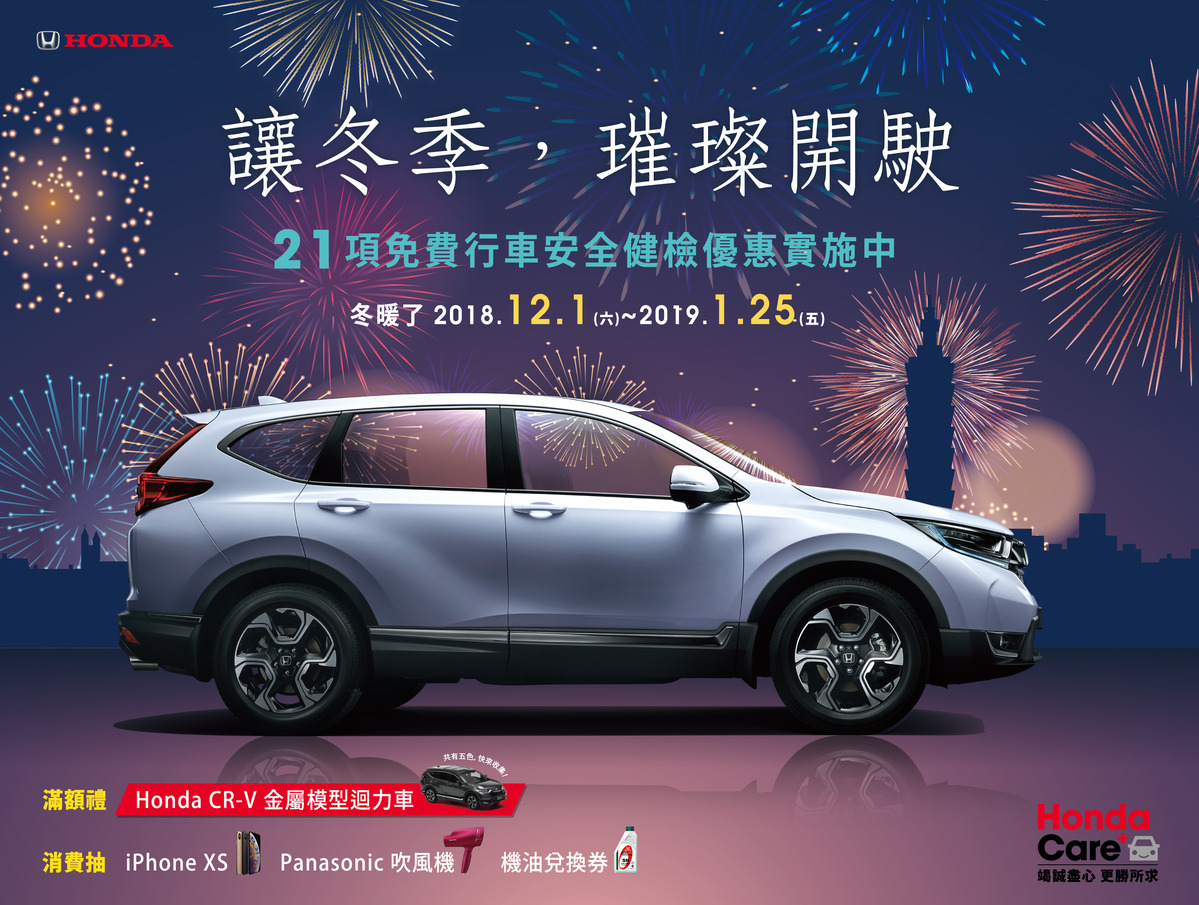 歲末迎新春,Honda Taiwan 邀請車主就從Honda Cars迎接璀璨的開駛!即日起至2019年1月25日止,Honda Care +「冬暖了」活動正式起跑,回廠即享Honda Cars免費健檢,多項優惠同步啟動,滿額就送限量金屬迴力車及加碼再抽iPhone XS 等大獎,讓車主與家人一同開啟璀璨新年。