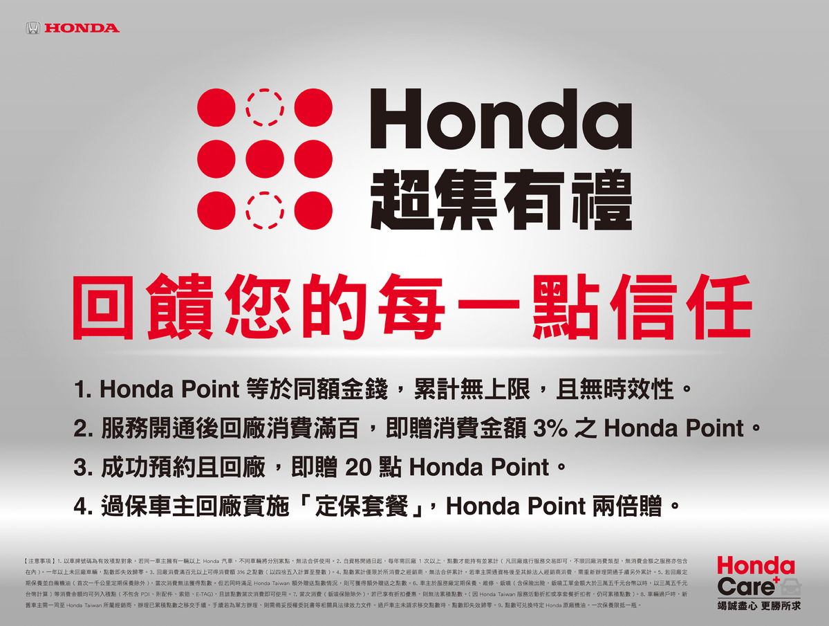 活動期間內,使用APP預約且回廠,最高共可獲60點Honda Point。