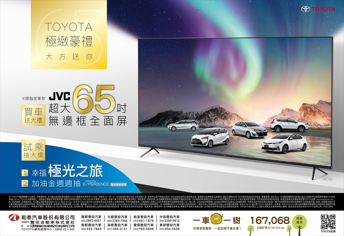 本活動之適用對象為購買TOYOTA國產車全車系及RAV4者,可獲得JVC T65 4K UHD 液晶顯示器乙台之兌換憑證乙張,請參考兌換卡背面之說明,並於兌換日期內完成登錄兌換,逾期視為放棄贈品兌換權利。贈品以實物為準,恕不接受更換或折抵現金。數量有限,送完為止。本活動相關限制及詳細兌換方法請參考兌換憑證背面或JVC官方網站(JVC.tv)「TOYOTA活動專區」。兌換後之贈品若有任何問題,請逕洽瑞旭客服中心:405-55088(手機需+02)詢問,和泰汽車不負任何贈品擔保責任。