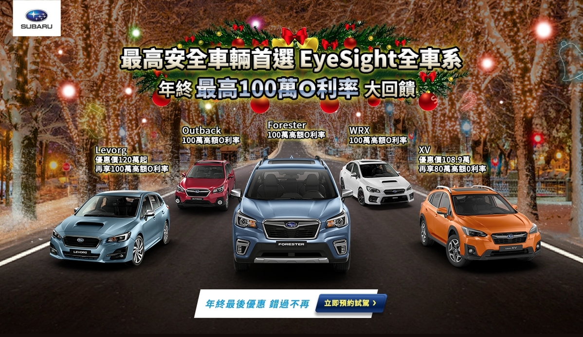 SUBARU台灣意美汽車為讓國內車迷輕鬆坐擁頂尖極致安全車款,特別推出「EyeSight全車系年終最後超值優惠」方案,包含最高「100萬分期零利率」和最高「現金優惠25,000元」等各項不同購車組合供準車主選擇。SUBARU EyeSight智能駕駛安全輔助系統擁有四大超越同級車款的產品特色,包含:全彩雙攝像立體鏡頭,如同人的雙眼判斷,更加安全;ACC自動定速巡航0-180公里全速域跟車,精準感測;可以辦識前方車輛、自行車、摩托車及行人;以及美國IIHS正面預防撞擊測試滿分。讓每一位車主於歲末年終之際,可以輕鬆入主最安全的車過好年!
