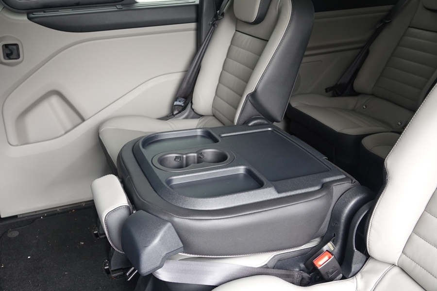 第二、三排中間座椅都可以椅背傾倒做電腦桌及杯架。