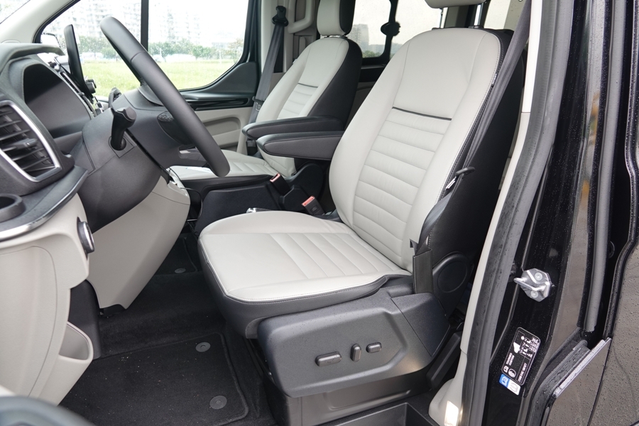 旅行家是筆者開過最大的Van,它比一般七人座的MPV來得大,因此在前面駕駛座及副駕座都比較高,上車時必須拉著拉把踏著踏板才好上車,車內座椅都是採雙色皮質包覆,駕駛座採八向電動調整及兩向腰靠調整,前雙座還有加熱功能,在台灣冬天不會太冷的氣候下,加熱功能大概是用不到的。