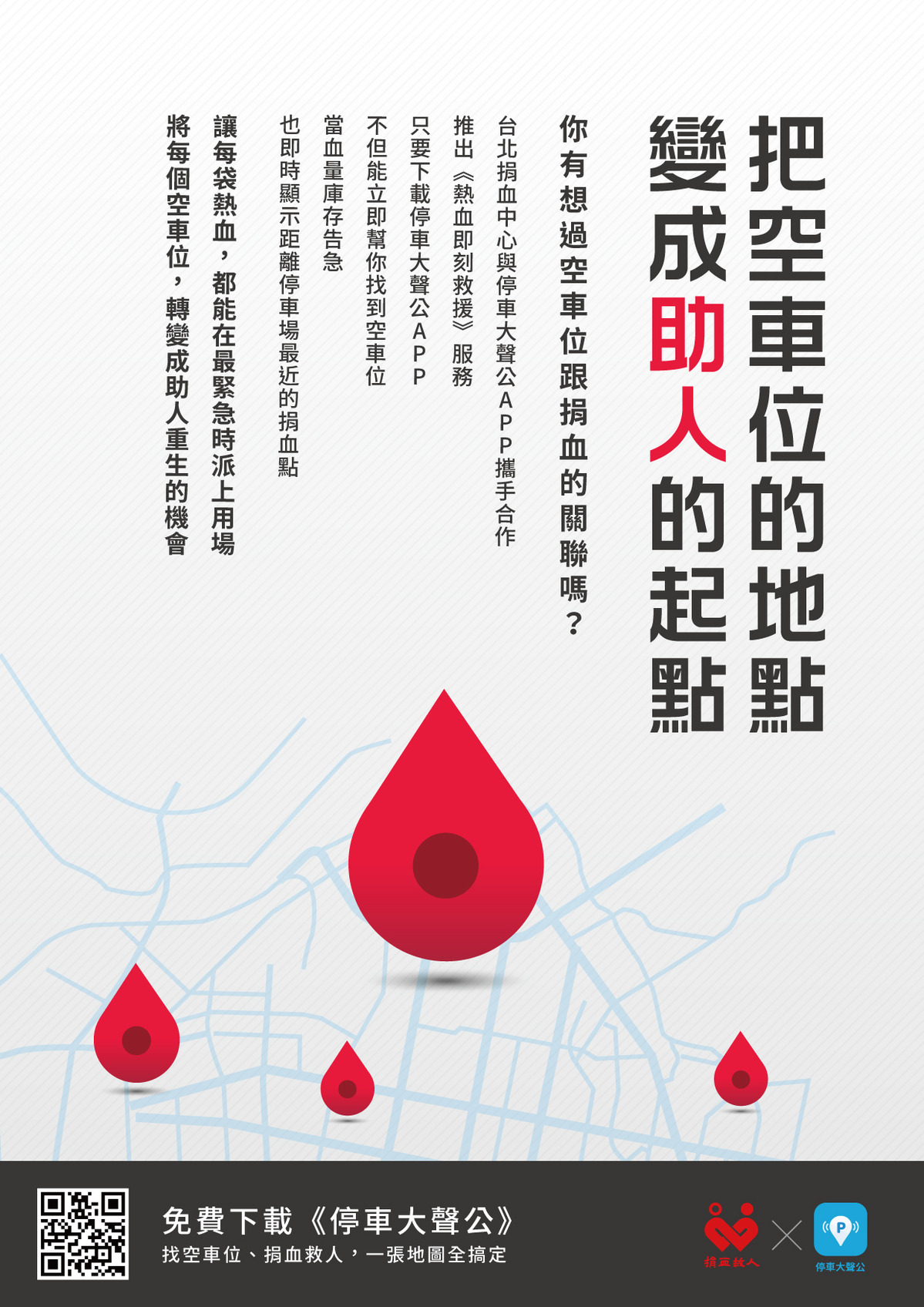 台北捐血中心長期以來和同樣關注缺血議題的智威湯遜廣告公司合作,以地圖定位標倒轉過來正是一個血液形狀做為創意發想,找來停車大聲公APP合作,希望透過創意的角色,讓捐血做公益輕鬆上手。由於冬天氣候寒冷,民眾的捐血意願降低而造成季節性血荒,又以年輕族群近幾年捐血比例低,而有志於挽袖捐血的人,卻不知道該上哪兒去捐血。為此,今年首度與停車大聲公App合作,整合平台既有的Google地圖導航、找車位功能,將捐血訊息融入年輕族群的日常生活和數位習慣,搭配定位標倒轉過來正是一個血液形狀的創意概念,造就了這次全新的數位服務,希望透過這樣的數位平台結合創意概念,即時公布缺血種類和捐血地點等相關資訊,吸引年輕族群的關注與好奇,並提供一個長期性的解決方案。