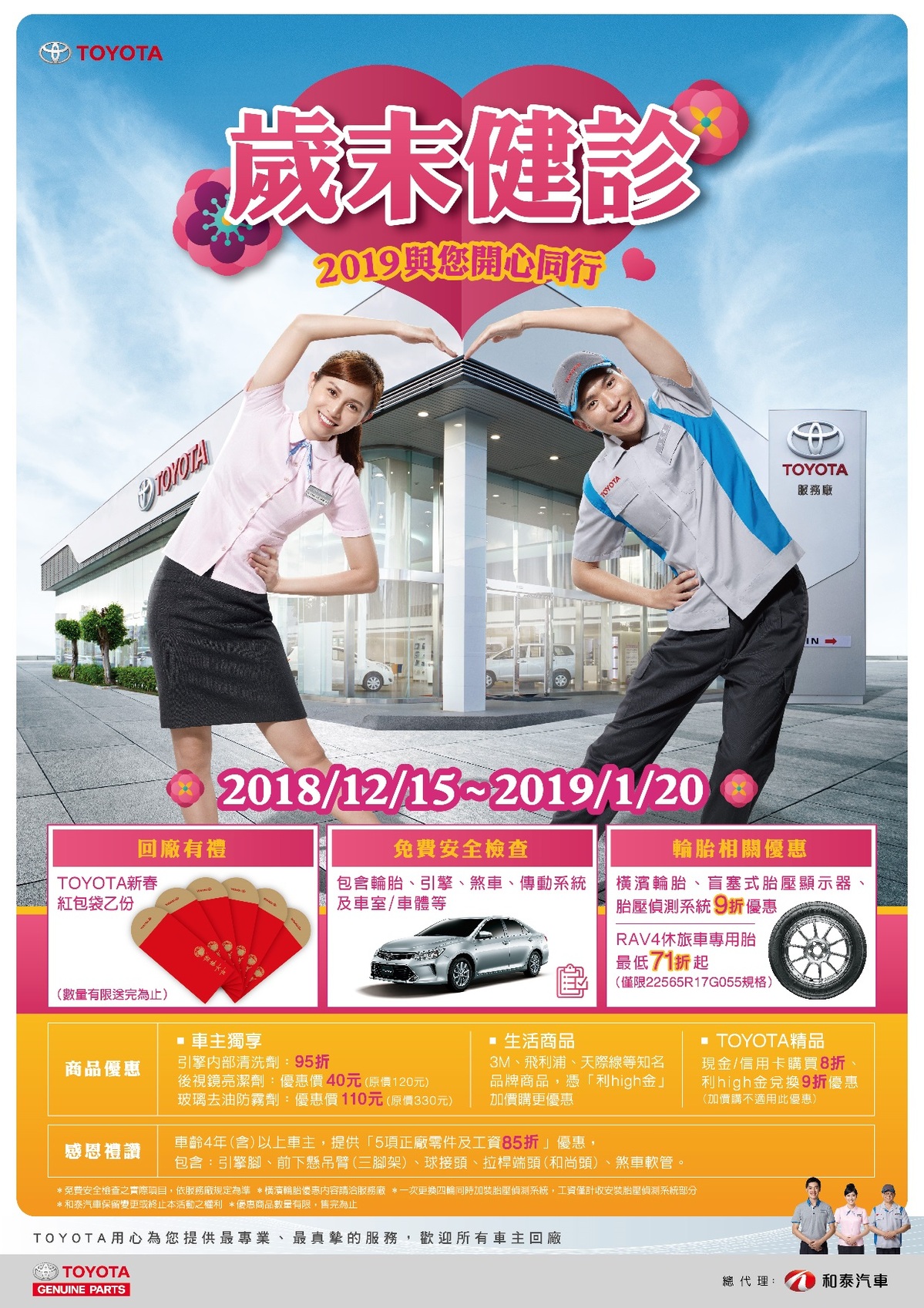 嶄新一年即將開始,讓TOYOTA陪您一起迎新送舊,幫愛車全面體檢、重新整裝再出發!TOYOTA台灣總代理和泰汽車於2018年12月15日~2019年1月20日,舉辦「TOYOTA歲末健診—2019與您開心同行」活動,邀請車主回廠,享免費安全檢查、新春紅包禮、輪胎相關優惠及多重商品折扣,禮遇車主最用心,用專業照顧您的愛車!