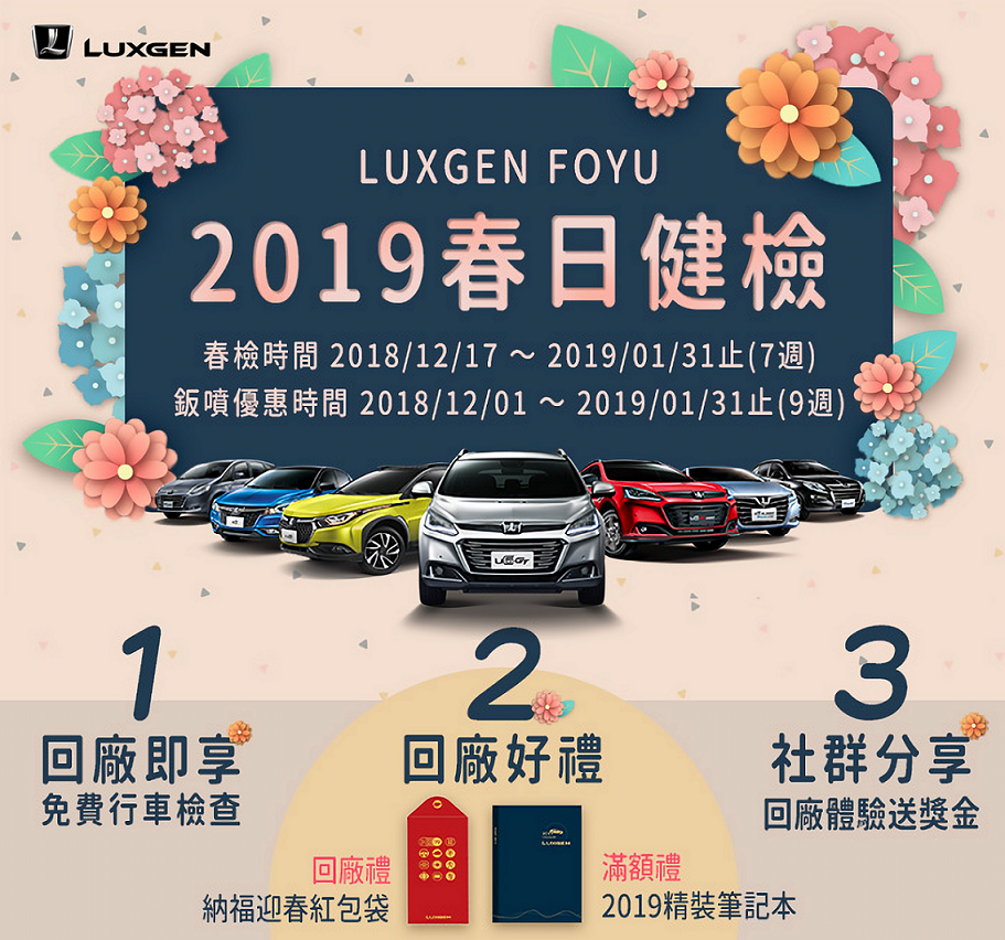 凡於春檢期間內預約回廠健檢,即可贈送專屬納福迎春紅包袋 (1);而消費滿6,000元還可再獲得送禮自用兩相宜的滿額禮-2019精裝筆記本;同時,回廠消費不限金額皆可加購攜帶便利又環保的LUXGEN鍋寶玻璃保鮮盒;另外,LUXGEN更於春檢期間推出「社群分享回廠體驗送獎金活動」(2):凡於春檢期間回廠健檢,並於指定服務廠之臉書專頁公開發文,獲得留言、按讚數、分享數最高之前三名,就有機會獲得獎金。歡迎所有車主及早預約回廠保養您的愛車,享受最專業的維修團隊、最貼心的服務,提供全方位的安全服務。欲知更多2019 LUXGEN FOYU春日健檢活動資訊,歡迎至LUXGEN活動網站查詢。