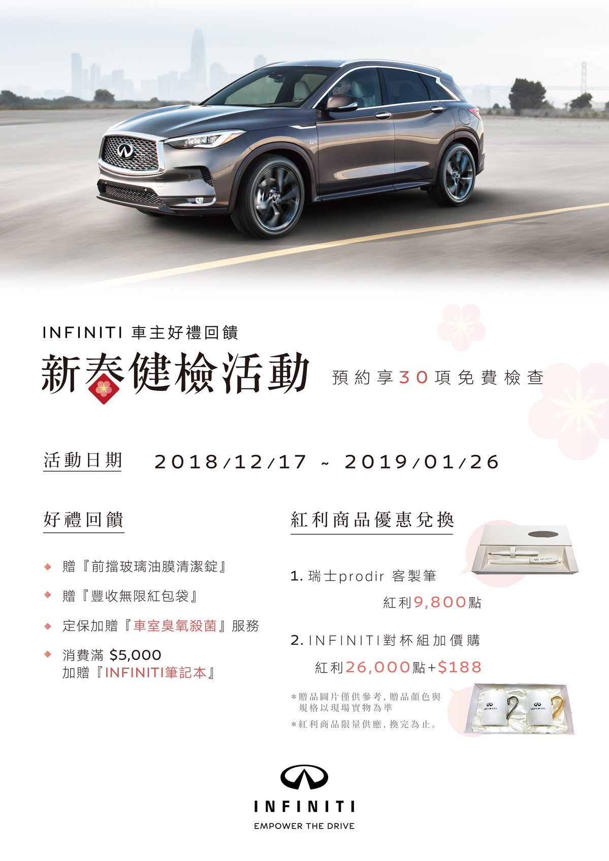 INFINITI為回饋車主,INFINITI 2019新春免費健檢活動期間,提供三大系統30項免費檢查(註2),並贈送「前擋玻璃油膜清潔錠」和「豐收無限紅包袋」,以及提供多項精美紅利商品優惠兌換,例如以紅利點數9,800點可兌換「瑞士prodir客製筆」乙組,限量800組,更推出限量紅利商品加價購,讓車主可以紅利點數26,000點並加價新台幣188元兌換價值新台幣1,280元「INFINITI對杯組」乙組,全台限量600組。當日進廠消費滿新台幣5,000元(含)以上者,再贈「INFINITI專屬筆記本 」。