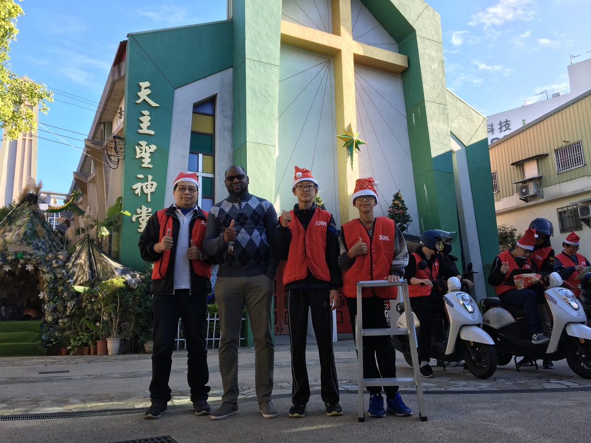 三陽SYM志工一大早群聚在「聖神堂」集合,來自越南的聖神堂主任司鐸阮西滿神父、與來自剛果的文衛雅神父,聽到三陽聖誕節志工活動也開心參與,肯定志工們為他人服務的奉獻熱情,是天主愛的見證。