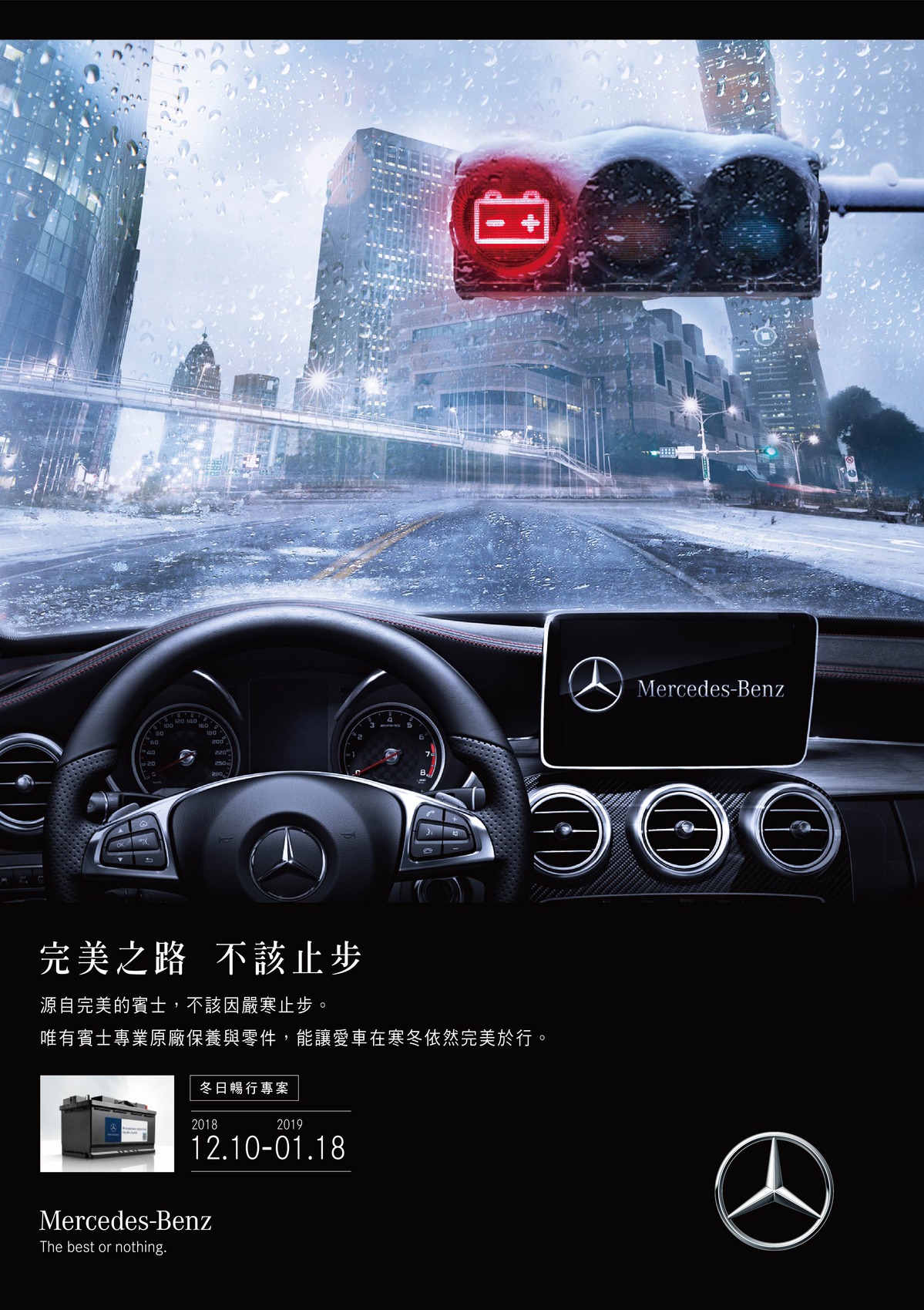 台灣賓士所推出的Mercedes-Benz推出Mercedes-Benz與smart冬季守護活動,邀請車主們回服務廠接受我們最專業的服務,旗下授權服務廠內專業硬體設備、認證技師、原廠零件皆擁有與Mercedes-Benz德國一貫的最高標準與嚴苛要求,可以針對不同車款、不同維修項目進行最完善的維修服務,且每項設備都需要依照德國母廠規範正確使用。