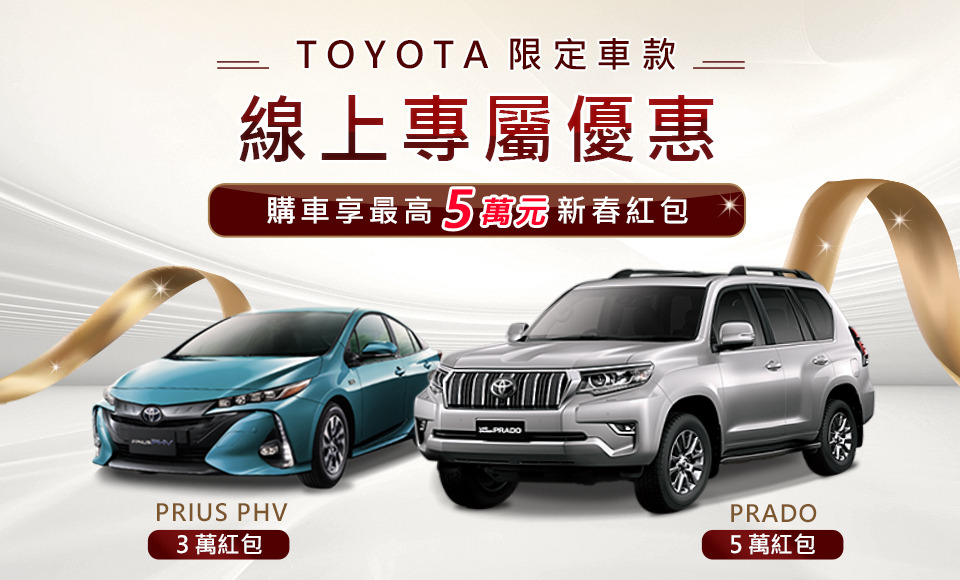 為鼓勵消費者來店體驗服務並購車,即日起推出限定車款 (PRIUS PHV、PRADO) 線上專屬優惠,只要於活動網站完成資料登錄並領取優惠代碼,並於購車時出示予銷售人員,經系統驗證成功即可於交車時獲得新春紅包(PRIUS PHV紅包3萬元、PRADO紅包5萬元),數量有限送完為止。