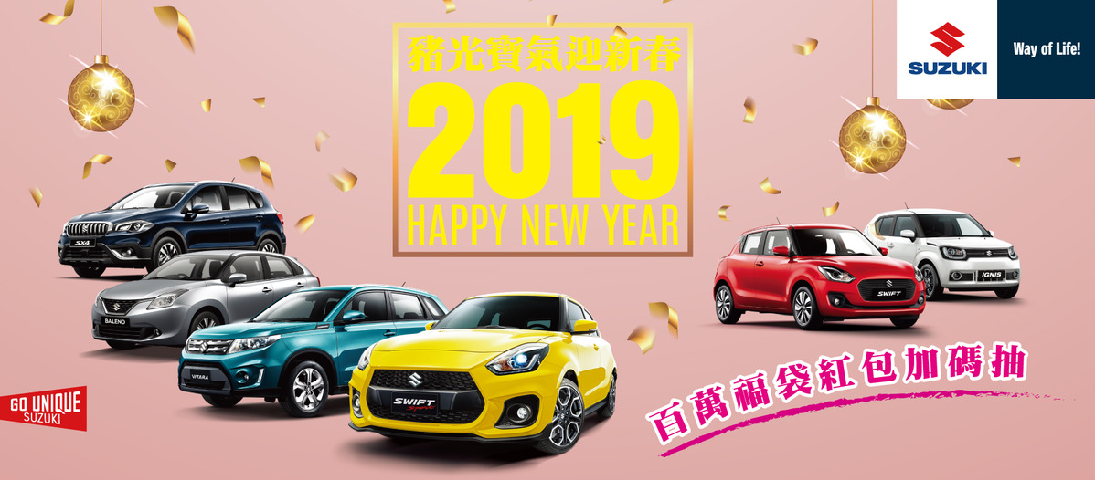 2018年,是SUZUKI充滿感謝與豐收的一年!回顧2018年,SUZUKI銷售持續穩定成長,也因備受消費者青睞而獲獎無數。2018年三月,SWIFT於紐約國際車展榮獲2018世界都會車TOP3,深受國際肯定!而SWIFT和IGINIS也分別為SUZUKI拿下台灣第13屆車訊風雲獎最佳進口小型車及最佳進口都會車殊榮。2018年底,SUZUKI趁勝追擊,舉辦在台以來首次規模最大及為期最長的「SUZUKI GO UNIQUE FUN DRIVING全國戶外巡迴展演活動」,總計13場次超過上千人參與試乘SUZUKI各式車款,活動佳評如潮。而伴隨著全台冬季最知名的大型節慶活動「新北市歡樂耶誕城」,SUZUKI也陪伴車主一同歡度了美好耶誕佳節。隨著農曆春節將至,SUZUKI於2019年元月推出「豬光寶氣迎新春,百萬紅包加碼抽」的春節購車活動,凡於2019年01月02日~2019年01月25日購買SUZUKI旗下任一車款,就有機會抽中新春大紅包,福袋紅包內容包含SUZUKI原廠維修保養券或遠東百貨禮券,讓車主購入新車之際也沾沾新年喜氣!展望2019年,就跟著SUZUKI跳脫一成不變的日常,創造屬於自己的獨特生活!歡迎至全台各經銷點賞車試乘。