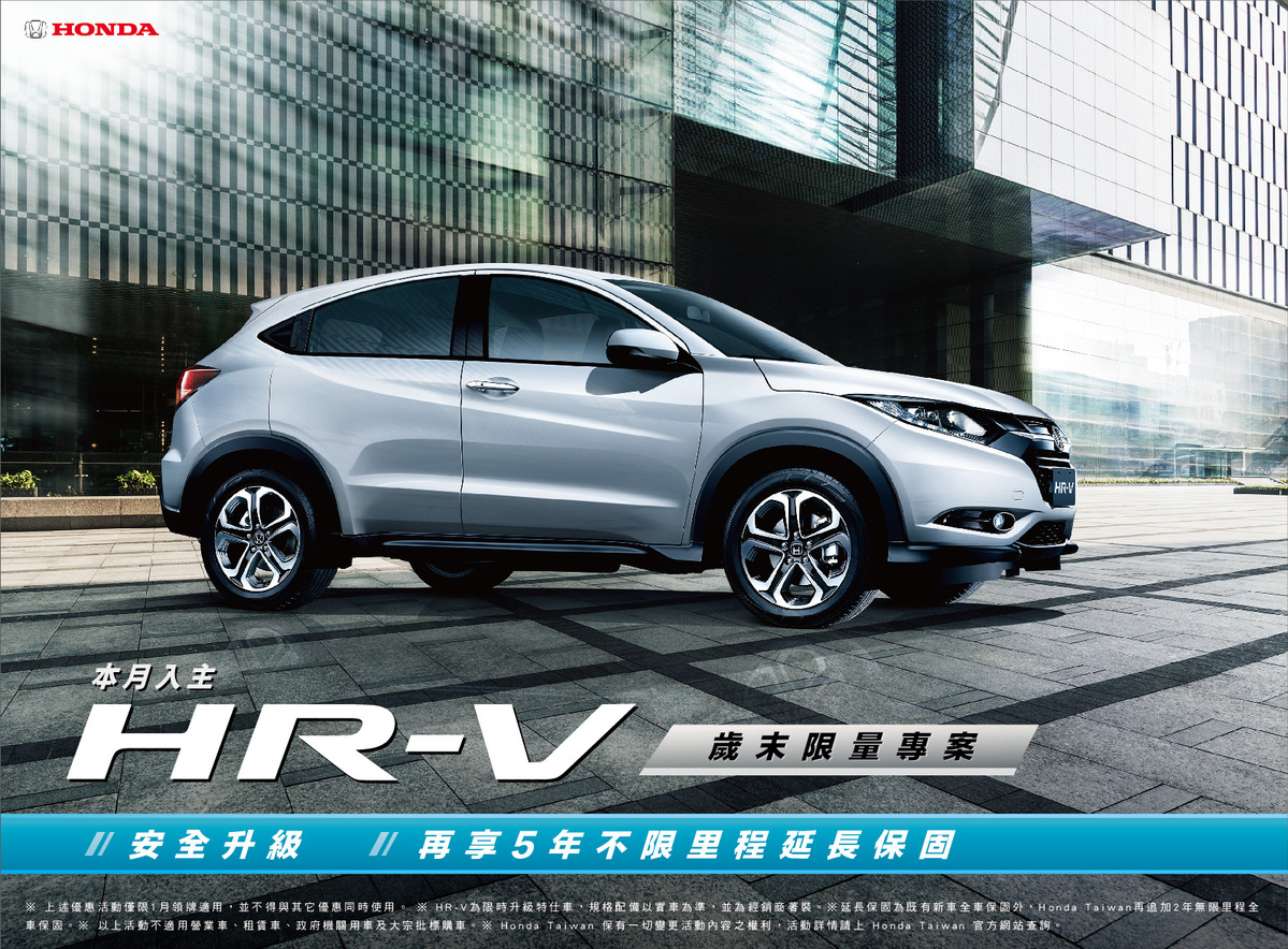 Honda Taiwan旗下暢銷車款Honda HR-V,以融合「SUV強悍安全」、「COUPE個性」、「MPV實用性」等跨級距優勢,加上搭載先進1.8L i-VTEC引擎可輸出達143ps的高效動力,平均油耗可達14.5km/L的最佳節能效率狀態;標配了九大主動安全系統,輔以進化G-CON及ACE高鋼性防護結構等豐富安全科技,再造至高「主、被動安全」、「高效能動力與節能表現」標竿。
