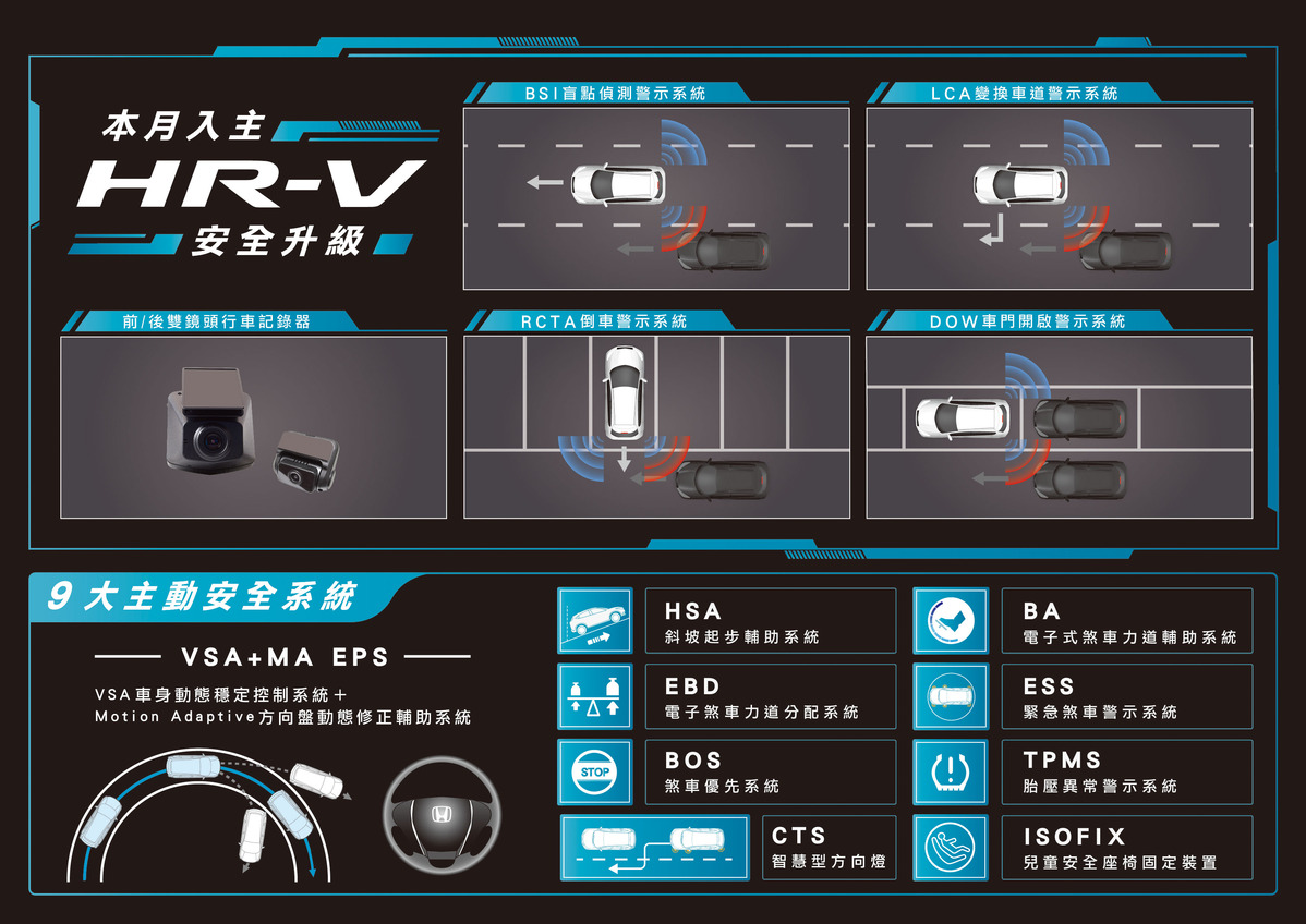 「HR-V歲末限量專案」免費升級多項高規格安全系統,包含「前/後雙鏡頭行車記錄器」、「BSI盲點偵測警示系統」、「LCA變換車道警示系統」、「RCTA倒車警示系統」、「DOW車門開啟警示系統」等,提供了再升級的主動安全防護功能。