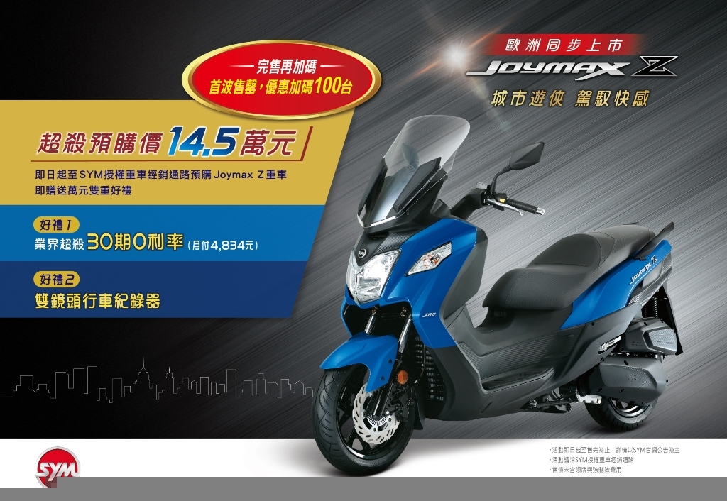 Joymax Z預購短短一個月,已超乎預期突破百台,為回應車友對SYM產品的愛戴,SYM決定再加碼100台,同享優惠價14.5萬,並加贈萬元好禮: