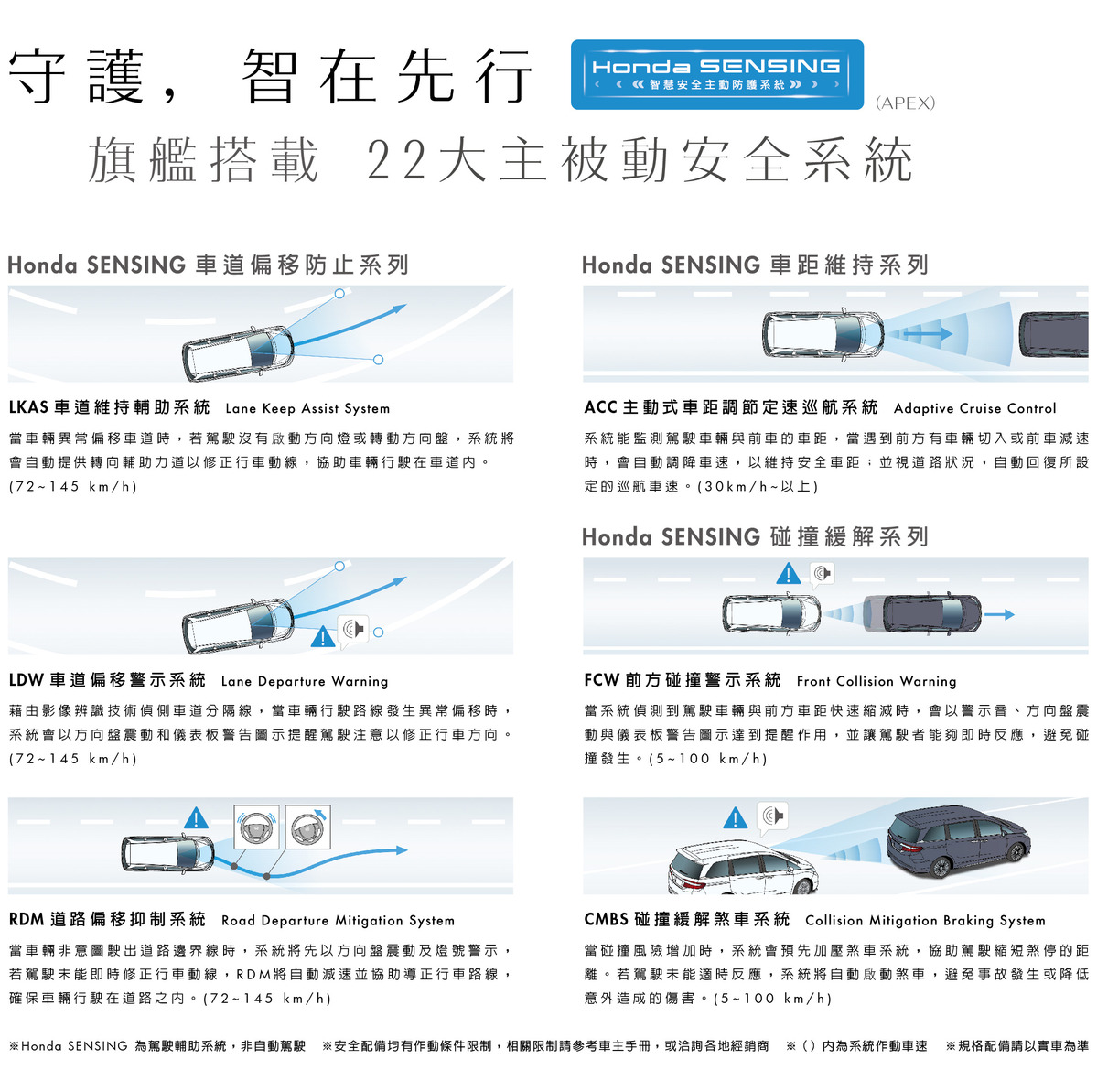 提供全員安全的旅程保護,是大型 MPV 車型最重要的價值,因此 2019年式Honda ODYSSEY持續提供22項最頂尖、最全面的主被動安全配備。在主動安全部份,Honda ODYSSEY全車系提供以智慧型安全主動防護系統「Honda SENSING」為首的安全科技,包含LKAS車道維持輔助系統、LDW車道偏移警示系統、RDM道路偏移抑制系統、ACC主動式車距調節定速巡航系統、FCW前方碰撞警示系統、CMBS碰撞緩解煞車系統、VSA 車身動態穩定系統、Motion Adaptive 方向盤動態修正輔助系統、HSA 斜坡起步輔助系統、BOS 煞車優先系統、EBD電子煞車力道分配系統、BA電子式煞車力道輔助系統、TPMS胎壓異常警示系統、ESS緊急煞車警示、CTS智慧型方向燈等九大安全,提供全面的主動安全機制。ODYSSEY APEX 車型標配360度環景影像輔助系統、主動式自動停車輔助系統、BSI 盲點偵測警示系統、CTM 倒車預警顯示輔助系統及,讓主動安全的配置超越同級。