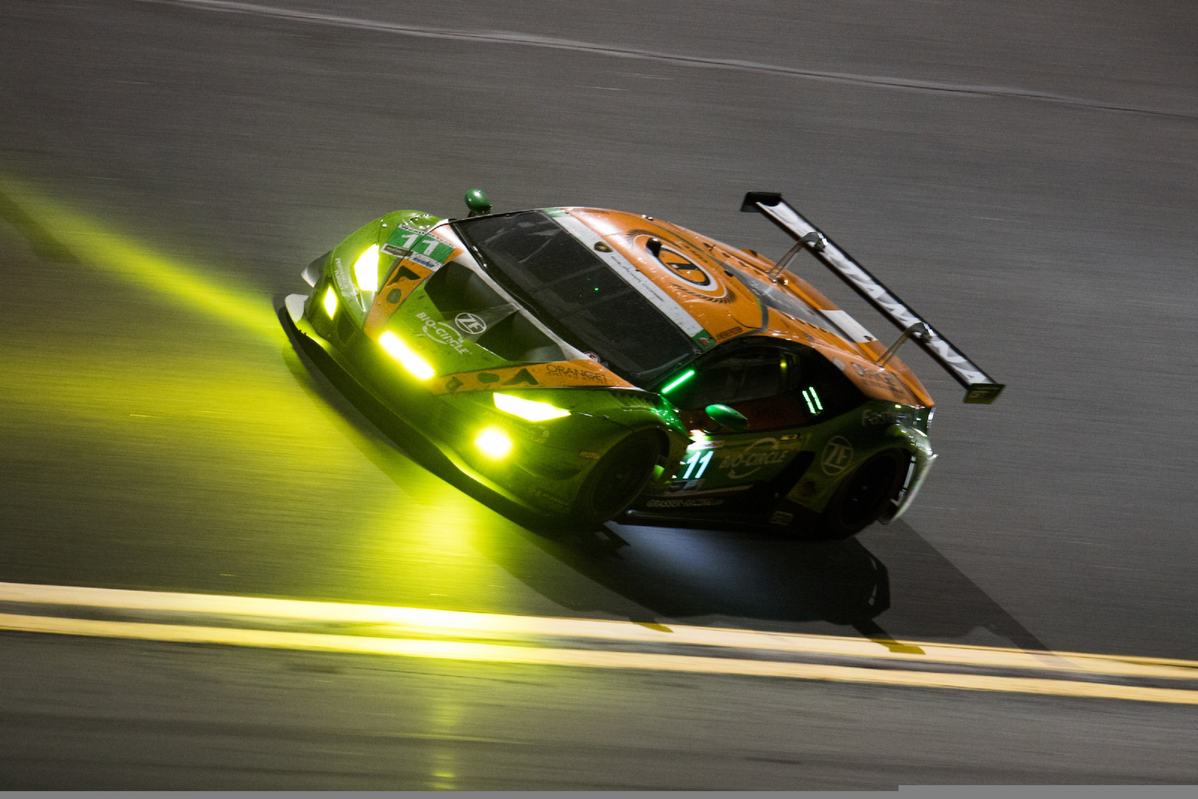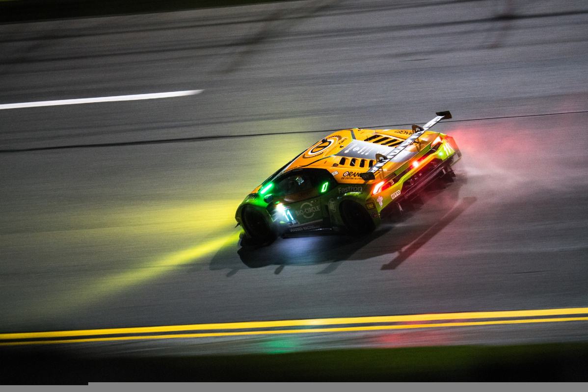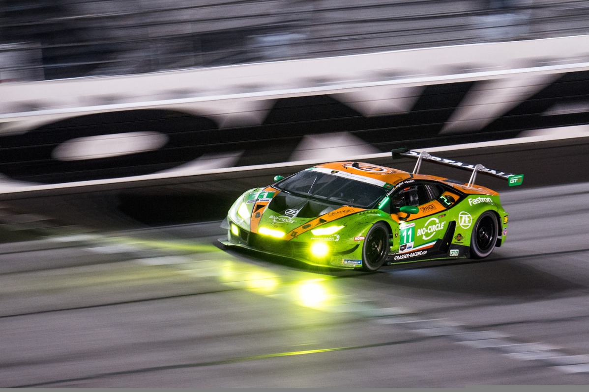 美國東岸當地時間1月26日午後,2019年度 Daytona 24小時耐久賽於佛羅里達的Daytona國際賽道上一觸即發。隸屬於Grasser Racing Team 的賽車手Rolf Ineichen,駕駛編號11號的Huracán GT3 EVO ,自第五排位發車,甫一開賽即展現強大的實力與極快節奏,超越編號46號的Huracán GT3 EVO,來到第三排位,並不斷向前展開炙烈追擊,直到判罰暫停之前,皆以首車之姿領先群雄。Rolf Ineichen交棒隊友Rik Breukers 後,一度來到第十六排位,經過一番雄鬥,在賽程第七小時結束前回到前方戰場,展開激烈爭位戰;在Lamborghini原廠車手Mirko Bortolotti接棒後,奮力抵禦後方對手的猛烈追擊,直到賽事因連夜的大雨暫停前,以毫秒之差領先,保持在排位第四。