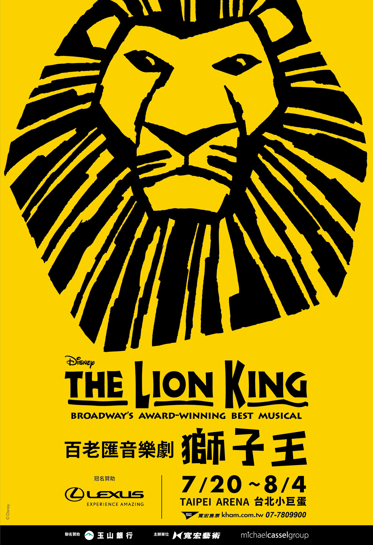 百老匯音樂劇「獅子王」展開歡慶20周年的全球巡演,最初首演至目前為止全球累積超過9千5百萬人次觀賞,其成就可說是超越音樂劇史上任何其他指標性的娛樂藝文表演。百老匯音樂劇《獅子王》於1998年贏得六座東尼獎包括:最佳音樂劇、最佳場景設計、最佳服裝設計、最佳燈光設計、最佳編舞及最佳導演,更是全球最受歡迎及最賣座的音樂劇。透過小獅王辛巴遠離家庭的冒險,歷經生命的重重考驗與難關,從成長的疑惑中負起成為王者的重責大任,這趟愛與冒險的生命感動之旅,就在令人驚豔讚嘆的視覺特效、創意無限的舞台道具、撼動人心的音樂及生動逼真的非洲叢林及原野動物中展開。
