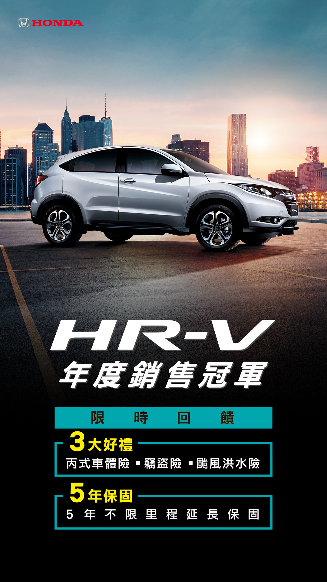 本月入主Honda HR-V,限時加贈「HR-V限時好禮」,免費升級「丙式車體險」、「竊盜險」、「颱風洪水險」等三大好禮及「5年不限里程延長保固」。