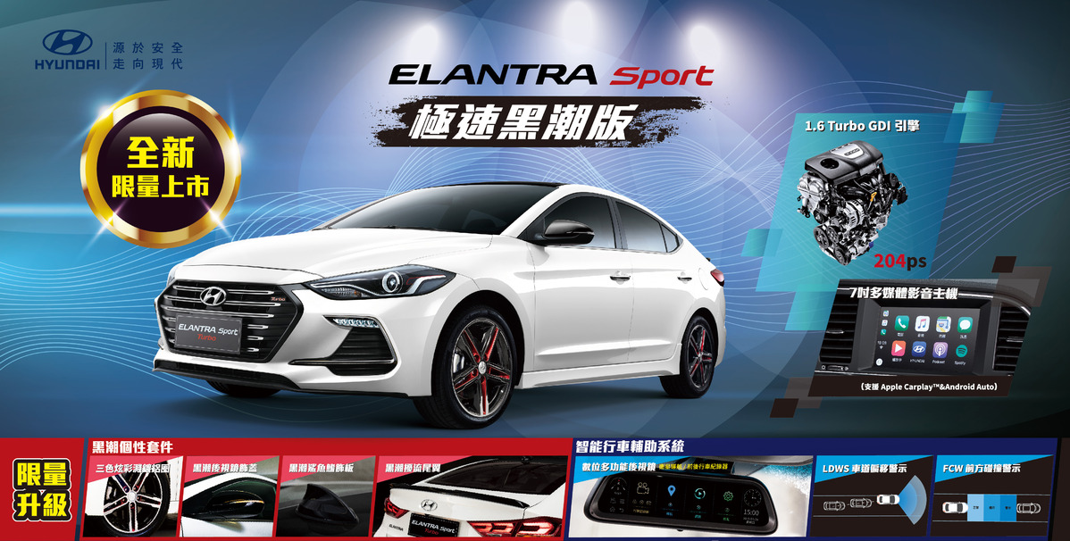 註1.極速黑潮版特仕車僅提供ELANTRA Sport極速車型,並僅限極地白或閃焰紅車色。
