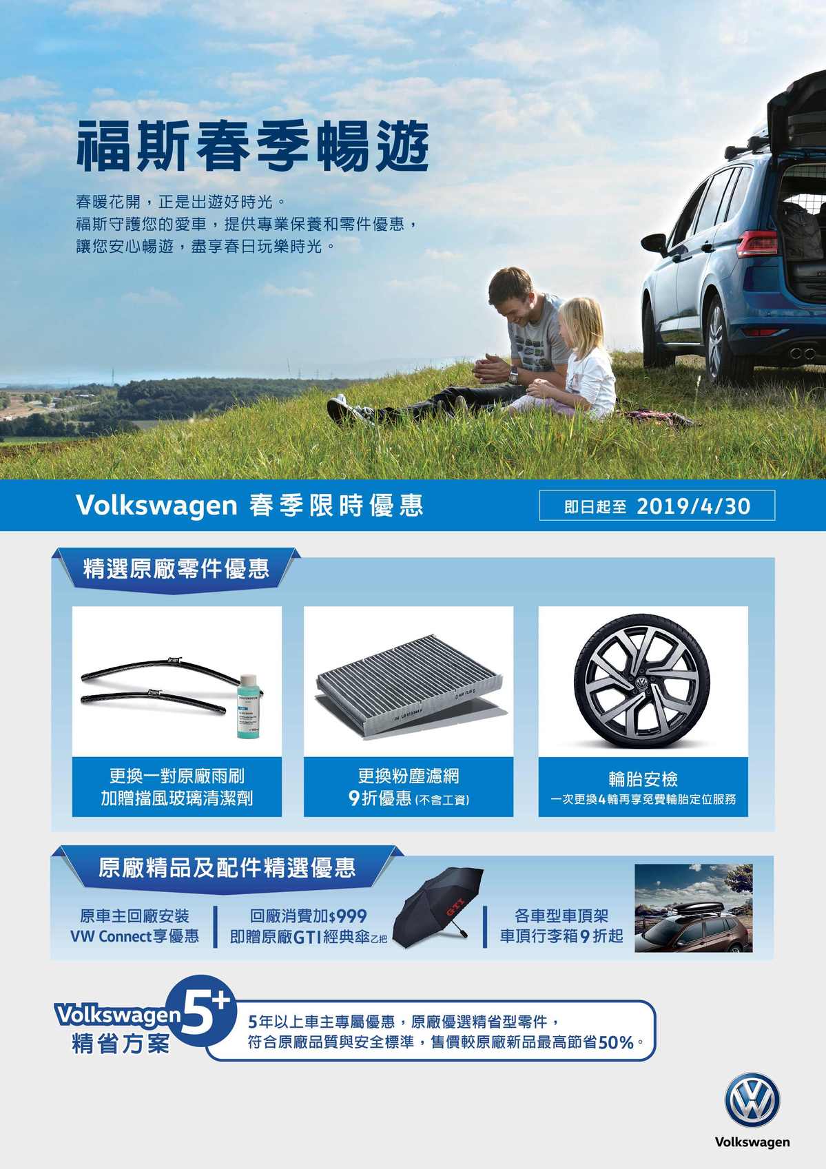 適逢春季來臨,天氣變化莫測,台灣福斯汽車貼心守護每一位Volkswagen車主之行車安全,即日起至4月30日,於全台授權服務中心提供原廠零配件、精品優惠;此外,針對5年以上之車主,更推出專屬Volkswagen 5+ 精省方案,提供多項符合原廠品質與安全標準的優選精省型零件,讓車主在即將到來的美好春日,快樂出遊,平安返家。