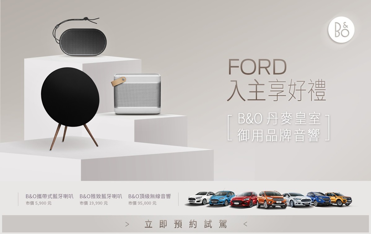 Ford多年來不斷導入符合消費者期待的全方位車型陣容,以滿足消費者不同的使用需求。為讓消費者輕鬆入主,Ford於四月份推出「FORD春季好禮雙重奏」多重購車優惠專案及B&O丹麥皇室御用品牌音響好禮。指定車型入主即贈B&O Beoplay P2攜帶型藍牙喇叭或B&O Beolit 17雅致藍牙喇叭,全車系交車再抽B&O Beoplay A9 MKⅢ頂級無線音響(價值95,000元)。