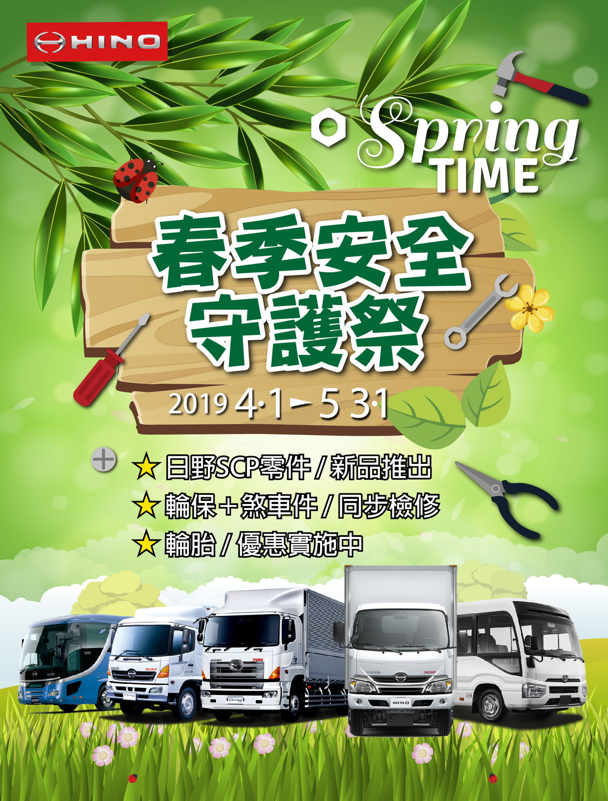 HINO商用車台灣總代理和泰汽車自4月1日起至5月31日止,舉辦「春季安全守護祭」安檢活動,邀請HINO商用車、TOYOTA Coaster中巴車主回廠為愛車實施安全檢查,讓車主能隨時保持愛車在最佳狀態,安心打拼事業。
