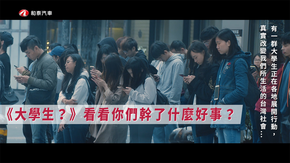 《大學生?》影片旁白以疑問的語氣呈現對大學生玩耍、不念書或是容易感情用事等刻板印象,但畫面卻是暖心呈現大學生在台灣各地發動的公益行動,像是無塑消費教育、流浪動物福祉實踐、街友及長者關懷等活動,將大學生上山下海,用實際行動讓台灣更美好真實呈現!更邀請到台大葉丙成教授在片中肯定讚揚大學生所幹的好事,並與和泰汽車一起邀請更多大學生一同來讓台灣更美好!